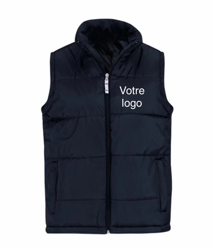 Veste légère sans manches pour homme. Ouverture principale et poches côté avec zip. Curseurs en métal avec tire-zip fantaisie noir.